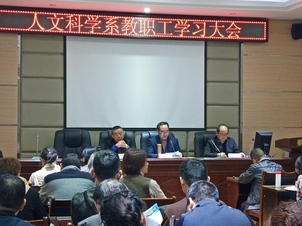 3月31日,人文科学系在实验楼一楼会议室召开全体教职工学习大会,系党总支书记晏永明、系主任杨富、系党总支副书记陈向东出席会议,晏永明主持会议。