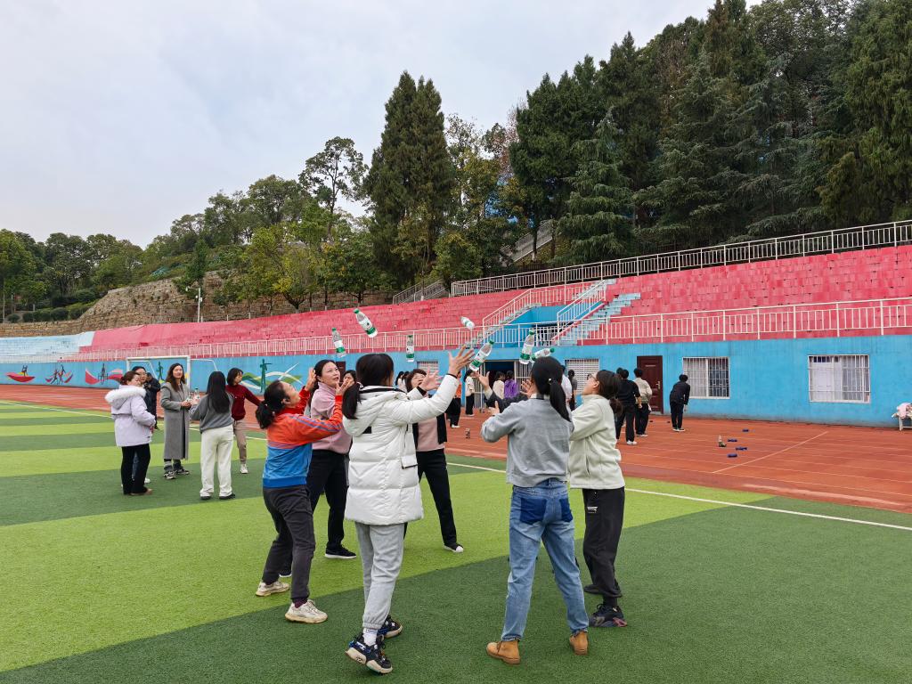 紧接着,趣味游戏环节将活动推向了高潮。“乒乓球接力”考验的是团队协作能力,女教职工们六人一组,用球拍接力运送乒乓球,大家你追我赶,现场欢声笑语不断。“移形换位”则更加紧张刺激,需要队员们灵活应变、默契配合,才能快速完成位置交换,赢得比赛。