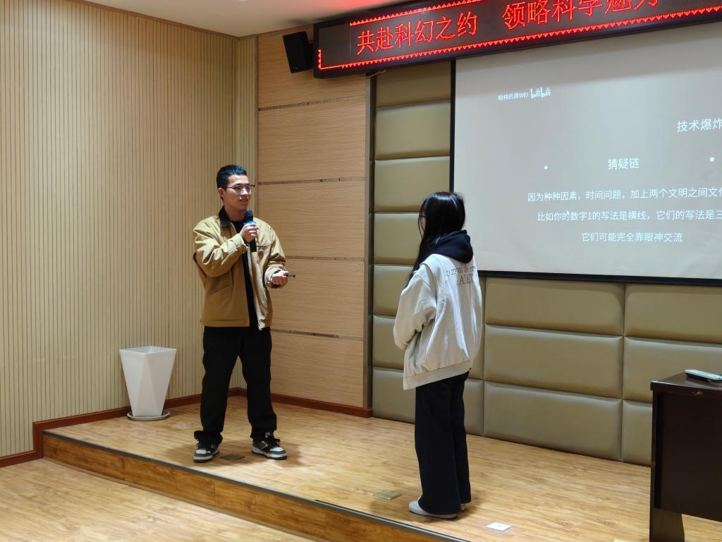 活动现场,师生围绕《三体》展开多维度、深层次的交流探讨,分享内容亮点纷呈,通过聚焦核心人物,通过剖析叶文洁的矛盾性、罗辑的成长弧光、史强的务实智慧,展现平凡个体在文明危机中的责任觉醒与担当勇气;解构科幻设定的逻辑内核,以“猜疑链”理论为切入点,梳理宇宙文明博弈背后的理性推演逻辑;围绕“黑暗森林法则”展开跨界思辨,引发对宇宙生存法则与中华传统文化中“和而不同”理念的对比思考。