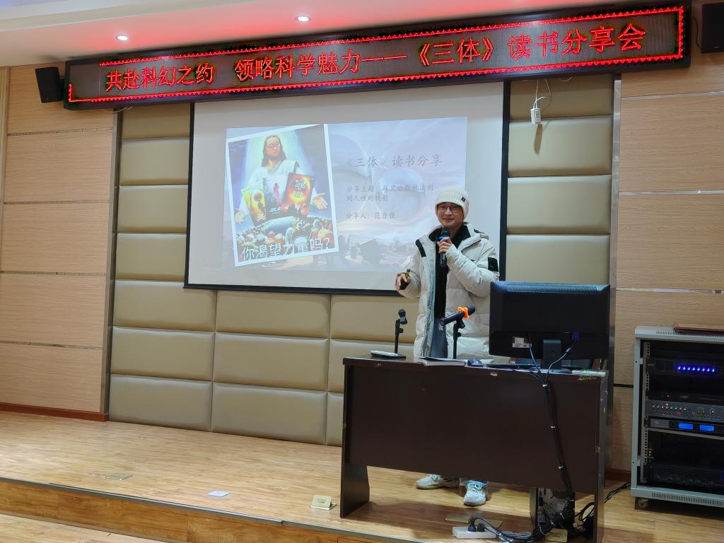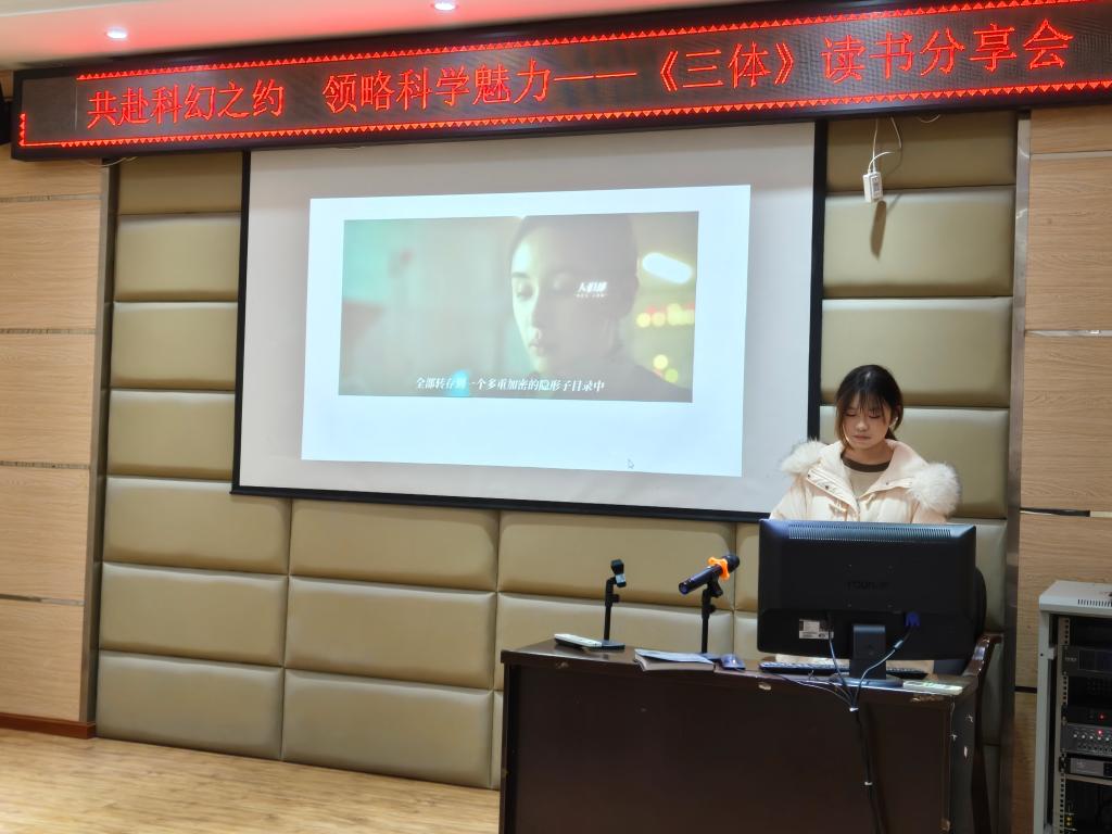 为进一步普及科学精神、传递科幻魅力,搭建科学与人文交融的思想对话平台,激发师生科学探索热情,为校园科学文化建设注入新活力,12月17日公共教育学院于人文大楼“科学精神与科幻小说普及基地”举办以“共赴科幻之约·领略科学魅力”为主题的《三体》读书分享会暨科学精神研讨活动。活动以刘慈欣科幻经典《三体》为核心载体,通过深度解读科幻文本、链接现实使命,为在场师生呈现了一场兼具思想深度与精神共鸣的文化盛宴。